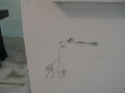Today when I was over at the house briefly to get these pictures, I also took the chance to paint the bathroom wall color samples (now that I can walk on the floor). Again, keep in mind my inspiration photo above. It's from a Pottery Barn catelog and I came across it several years ago. At the time, I envisioned using the wall color in a mud room or sun room or breezeway - in other words, a small room with lots of light, and a gardeny feel where I could put lots of potted plants. I even have some greeting card prints I've been saving to frame and hang.